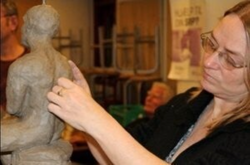 Left: Lotte Kjoeller moddeling a stoneware sculpture